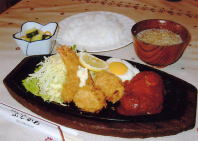 ハンバーグとカニコロッケとごはんとみそ汁とお新香で、980円。